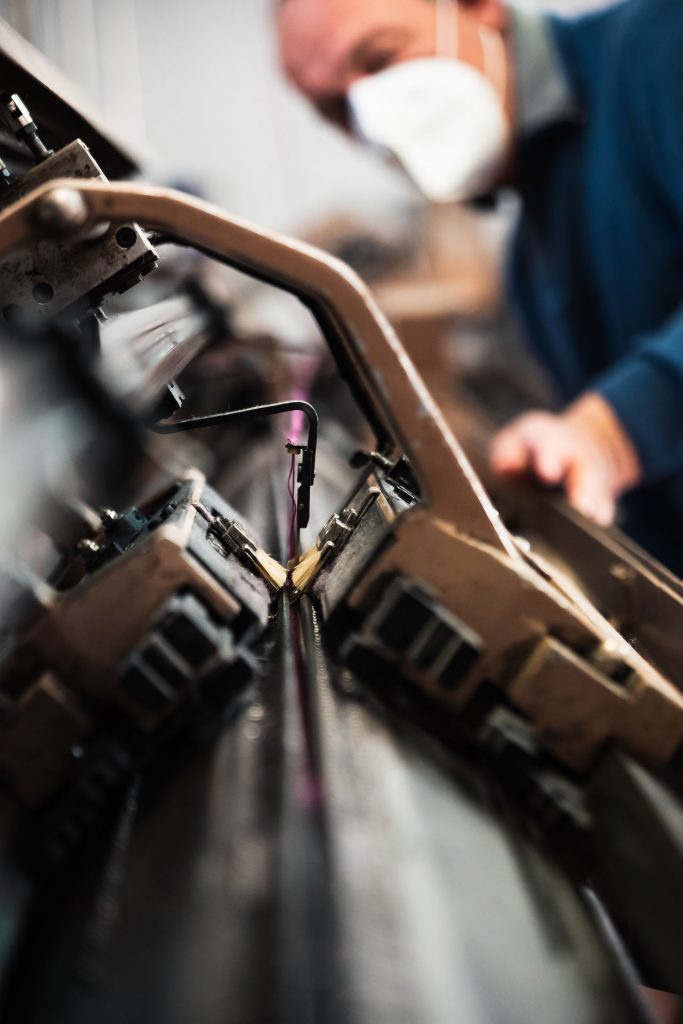 In questa fase le nostre rocche vengono messe in macchina, trasformandole grazie ad un elaborato gioco di aghi in teli, i quali saranno già tutti sagomati in davanti dietro e maniche, grazie alle calature, ottimizzando quindi i filati e riducendo al minimo gli sprechi, inoltre allo stesso tempo vengono smacchinate le finiture, ossia i bordi, colli e polsini.